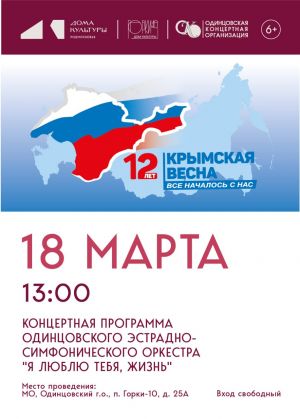 18 марта в Сельском доме культуры «Горки-10» состоится патриотический концерт Одинцовского эстрадно-симфонического оркестра «Я люблю тебя, жизнь», посвящённый 12-той годовщине воссоединения полуострова Крым с Российской Федерацией.